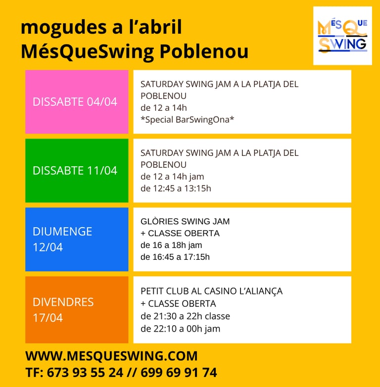 Ball a l'aire lliure a la Platja de Poblenou, al final de la Rambla. Sent l'olor de la mar mentre et mous al ritme de Swing i de les ones! T'ho perdràs? Properes:
